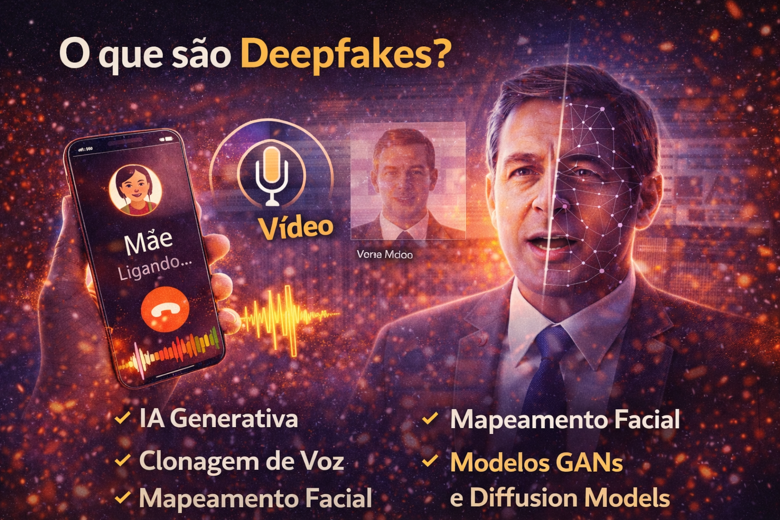Deepfakes são conteúdos falsos (áudio, vídeo ou imagem) criados com inteligência artificial, capazes de imitar pessoas reais com alto nível de realismo.
