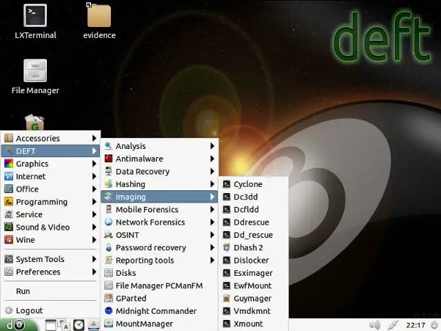 O DEFT Linux, que significa Digital Evidence & Forensic Toolkit, é uma distribuição Linux personalizada do CD Ubuntu Live. É um sistema fácil de usar que inclui excelente detecção de hardware e alguns dos melhores aplicativos de código aberto dedicados à resposta a incidentes e à análise forense de computadores.