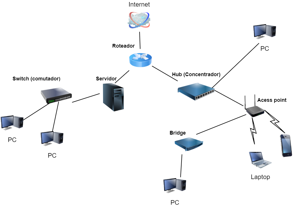 - Hub : Dispositivos básicos de rede que conectam vários dispositivos ou equipamentos eletrônicos em uma LAN, agindo como um único segmento de rede. O hub não pode filtrar dados, portanto os pacotes de dados são enviados para todos os dispositivos conectados. Eles não possuem a capacidade de distinguir entre os dispositivos, são dispositivos mais antigos do que o Switches, porém ainda são usados até hoje.