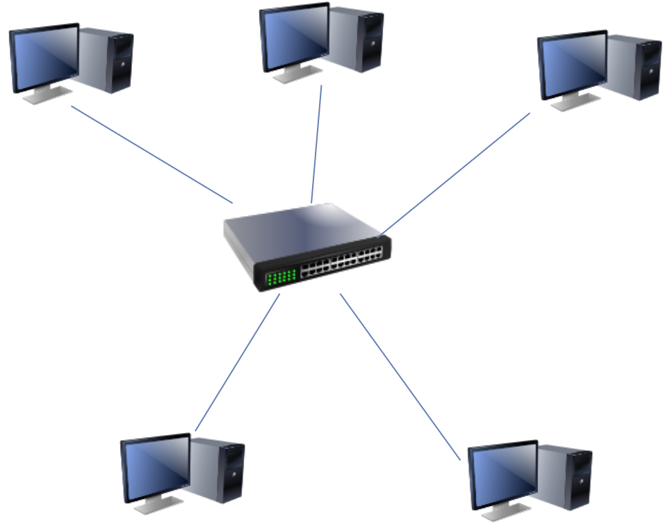 A topologia em estrela é um tipo de configuração de rede em que todos os dispositivos estão conectados a um ponto central, chamado de hub ou switch. Cada dispositivo possui uma conexão direta com o hub, formando uma estrutura que se assemelha a uma estrela, daí o nome. Uma das suas principais caracteristicas é a centralização.