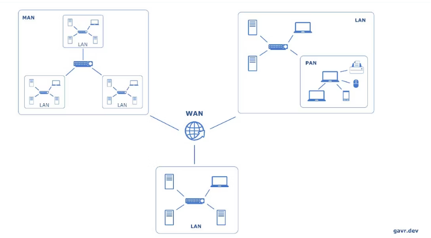 - Rede de Area Local (LAN, em inglês Local Area Network ): Abrange uma área geográfica relativamente pequena, como uma casa, escritório ou edifício. Essa rede permite a comunicação e o compartilhamento de recursos entre dispositivos, como computadores, impressoras, servidores e dispositivos de armazenamento, dentro dessa área local.Na prática as LANs são muito usadas em ambientes empresariais para facilitar a comunicação e o compartilhamento de recursos entre os funcionários. Elas podem ser conectadas à internet para fornecer acesso à rede global.