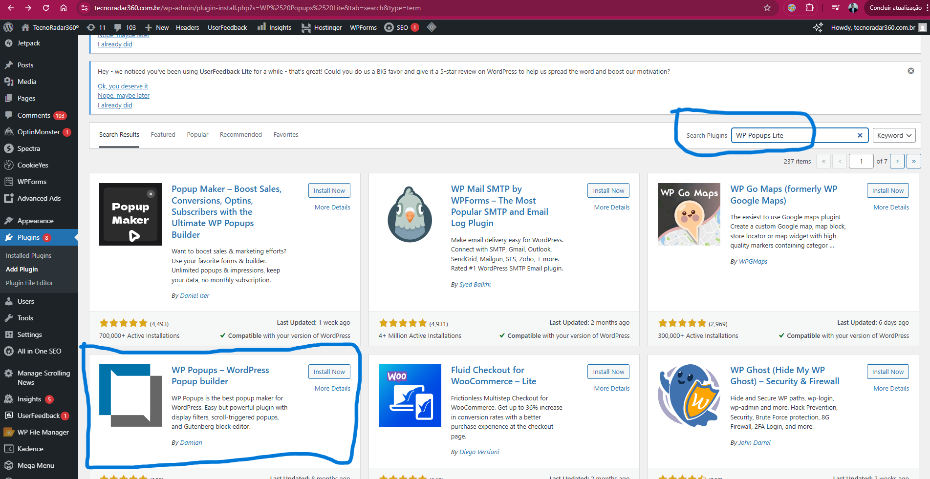 O primeiro passo é instalar o WP Popups Lite diretamente pelo painel do WordPress.