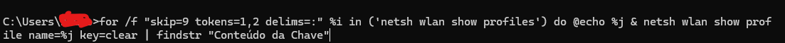 for /f "skip=9 tokens=1,2 delims=:" %i in ('netsh wlan show profiles') do @echo %j & netsh wlan show profile name=%j key=clear | findstr "ConteĂșdo da Chave"