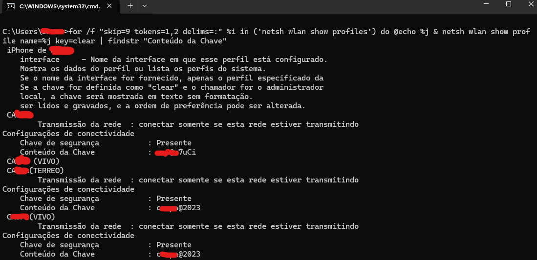 â ïž Esse comando mostra todas as senhas Wi-Fi salvas â use com cuidado e somente no seu prĂłprio computador.