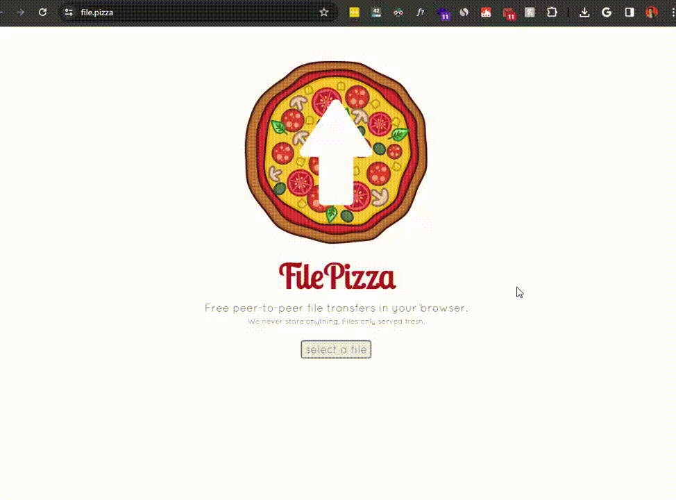 File Pizza é um serviço de compartilhamento de arquivos ponto a ponto que permite enviar arquivos grandes de forma rápida e segura sem necessidade de armazenamento em nuvem. Basta arrastar e soltar o arquivo para gerar um link de download.