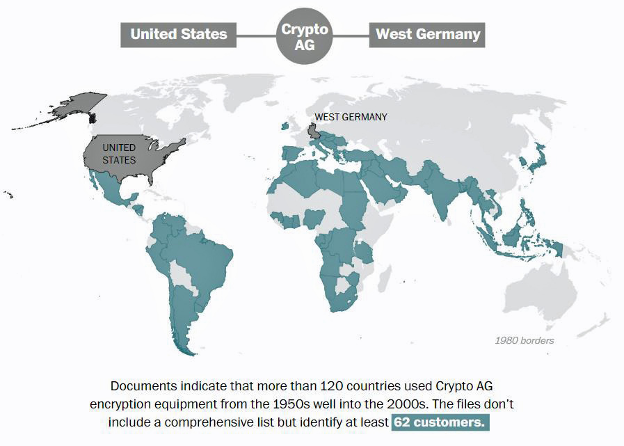> Comentário: Os Cinco Olhos e especialmente a NSA e o GCHQ têm capacidades enormes, mas a espionagem de “todo o planeta” ainda é bastante exagerada: os seus esforços de recolha são limitados pelas prioridades nacionais, os locais onde podem aceder ao tráfego de satélite e cabo, bem como por restrições técnicas. Embora os cinco membros da aliança Europeia Maximator tenham/tivessem capacidades muito menores, eles poderiam, no entanto, interceptar e descriptografar comunicações diplomáticas de mais de 60 países onde os dispositivos de criptografia enfraquecidos da Crypto AG foram usados (veja o mapa abaixo).